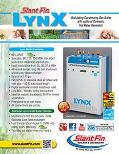 SlantFin's new Lynx sealed combustion gas boiler purrs with performance. Compact, lightweight for easy handling.Slant Slash Fin Lynx Download Now Operating Manual Free.Please help find the manual for this SlantFin Boiler. Compact, light weight for easy handling. Database contains 1 SlantFin Lynx Manuals (available for free online viewing or downloading in PDF): Specifications .Slantfin LX-150 Pdf User Manuals. View online or download Slantfin LX-150 Installation And Operating Instructions Manual, User's Information Manual.SlantFin LX-90-NG - LX-90, 70,000 BTU Output Condensing Boiler (Nat Gas) - The new generation modulating, condensing gas boiler is here! Lynx Modulating Condensing Gas Boiler is compact, powerful and agile. User manuals, SlantFin Boiler Operating guides and Service manuals.. Users Information Manual - English; User Information Manual - French; Warranty - French.Abb Genway Xiamen Electrical Equipment Co Ltd M2136 Download Online Free Owner's Handbook Manual.Slant Slash Fin Lynx Download Online Free Quick Start Guide.Download Microbiology An Introduction With Masteringmicrobology Hardback Hardware Installation Manual Free.Slant Fin is one of the leaders in home heating appliances for both commercial and residential homes. EMBED. Had the propane gas company come out to connect the gas and do final checks and startup. I posted a link to the slant fin CHS over the LYNX as I', told stainless heat exchangers are better then aluminum.