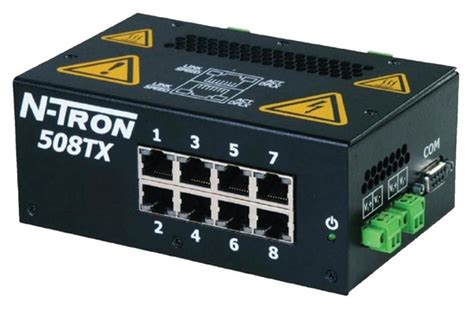 Current slide {CURRENT_SLIDE} of {TOTAL_SLIDES}- Top picked itemsOptional kits are available for rackmount applications. The N-TRONTM 405TX Industrial Network Switch is designed to solve the most demanding industrial.The N-TRON 508TX Series Industrial Ethernet Switch offers outstanding performance and ease of use. The switch comes standard with extended temperature rating, extended shock and .of N-TRON products rests with the end user. NTRON 508TX. The .8 Port Industrial Ethernet Switch Eight 10/100BaseTX RJ-45 Ports; IEEE 802.3 Compliance-40° to 85° C Operating Temperature; Autosensing 10/100BaseTX, Duplex, and MDIX.The Red Lion N-Tron ® Series 508TX is an Industrial Ethernet Switch that offers outstanding performance and ease of use. 8 port 10/100BaseTX, Industrial Ethernet Switch, DIN-Rail. The N-TRON® 508TX Series Industrial Ethernet Switch offers outstanding performance and ease of use. assortment of LEDs. assortment of LEDs.